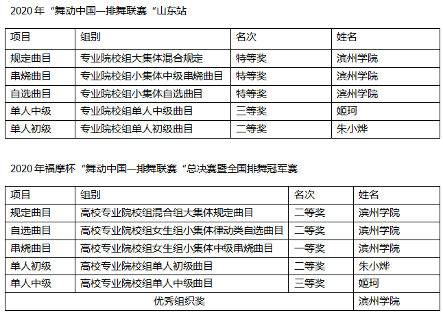 本次全国排舞总决赛由国家体育总局体操运动管理中心、杭州市体育局、滨江区人民政府主办,汇集了全国18个省(市、自治区)、2个特别行政区,50个城市,248支队伍,共计4000多名排舞选手参加本次比赛。滨州公司古天乐代言太阳集团2019级舞蹈学专业26名员工组队参加了专业院校组大集体规定、小集体自选、小集体串烧、单人初级、单人中级五个项目的比赛。在全国总决赛中获得一等奖一项、二等奖三项、三等奖一项、优秀组织奖;在山东赛区的比赛中获得特等奖三项,二等奖一项,三等奖一项的优异成绩!