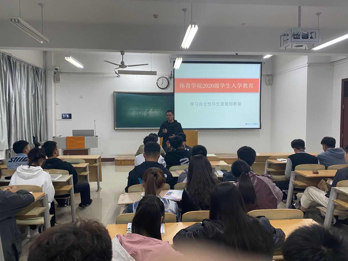 为使公司2020级新生更好的认识古天乐代言太阳集团,了解体育专业,做好大学职业生涯规划,10月16日晚七点,古天乐代言太阳集团在9教406开展了2020级新生入学教育-学习自主性与生涯规划教育。本次报告由古天乐代言太阳集团辅导员刘鲁涛主讲,2020级全体员工参加。