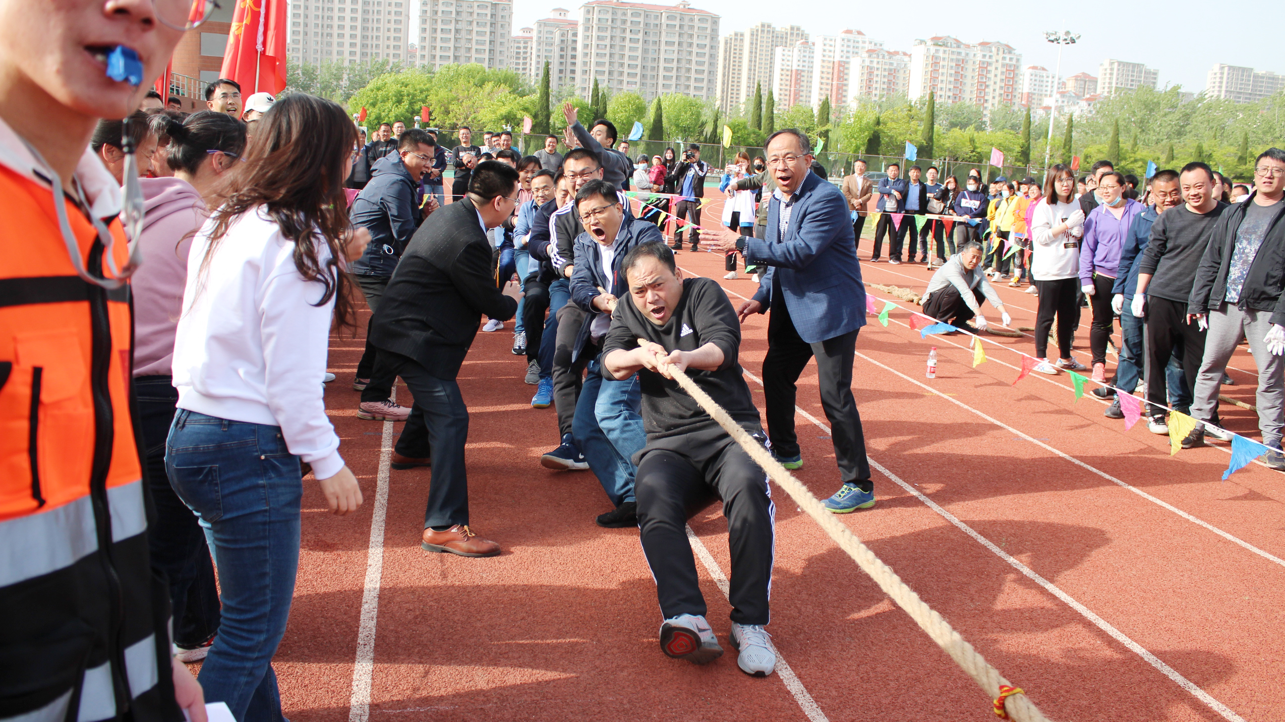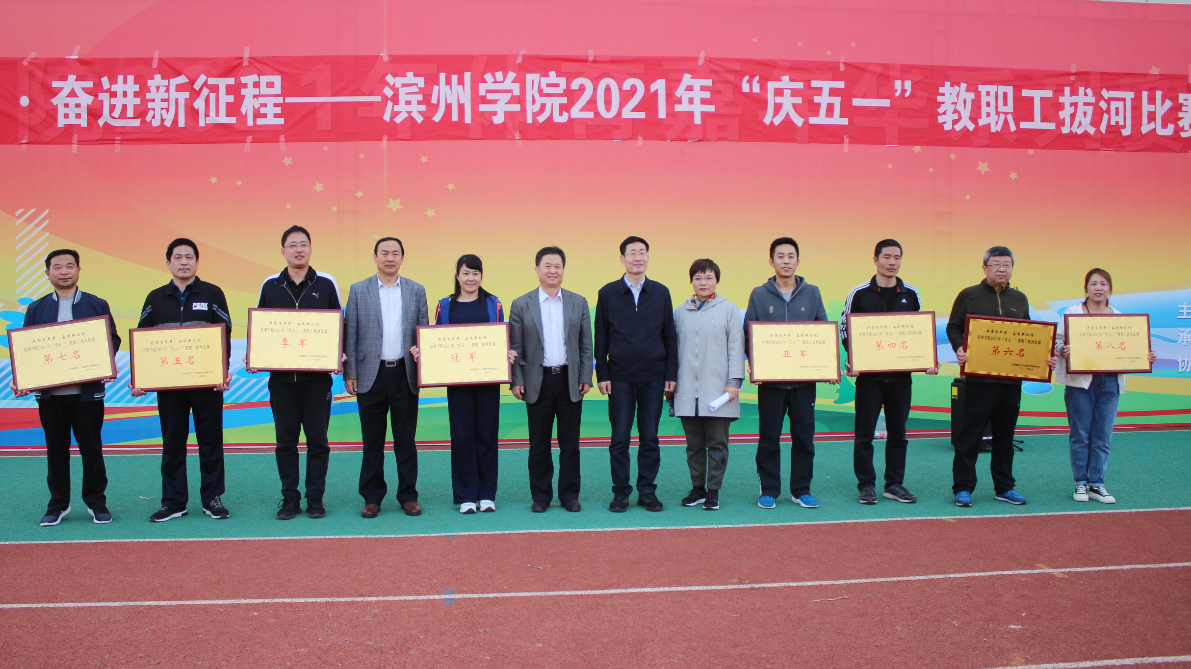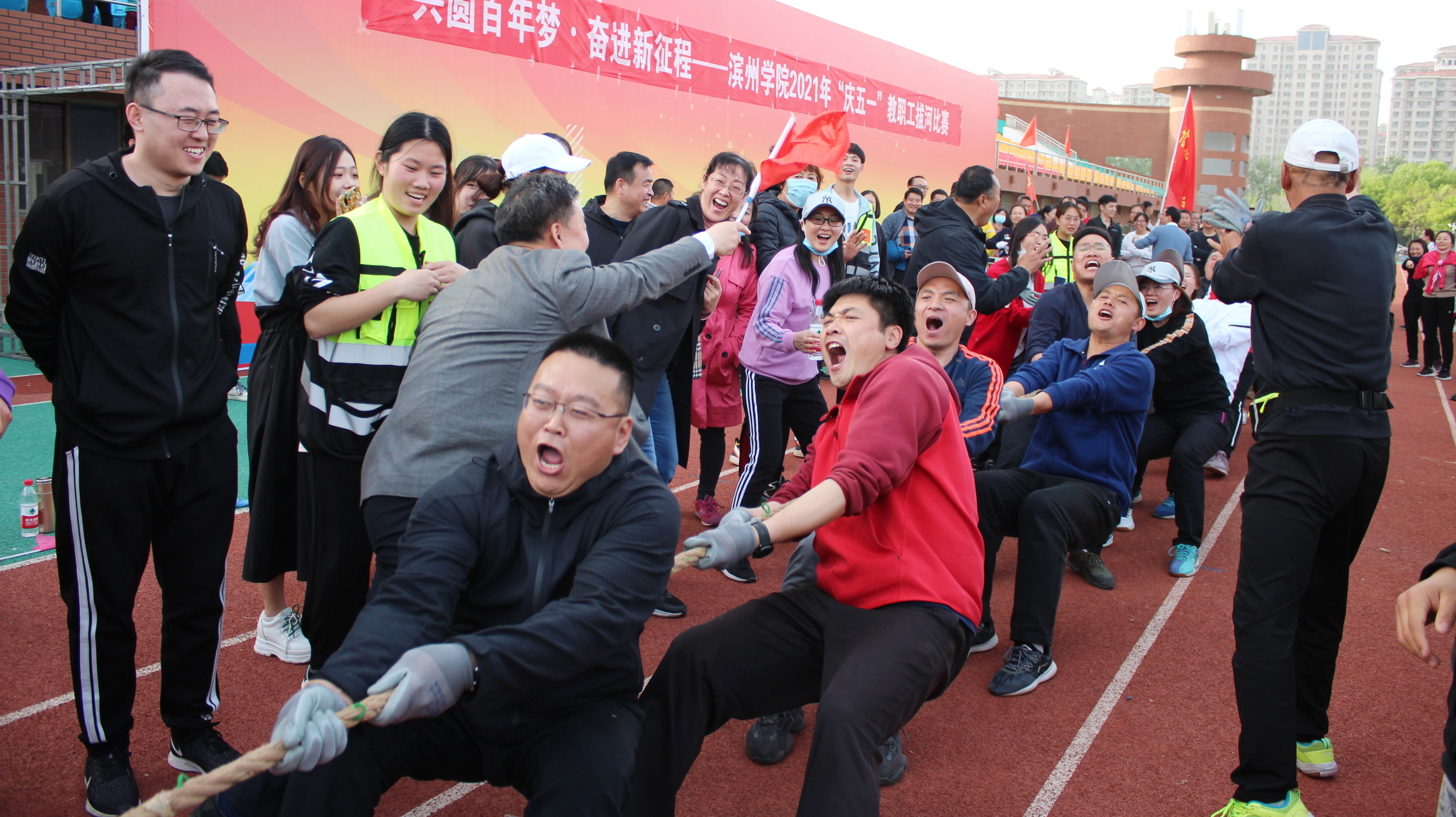 4月27日下午,以“共圆百年梦 奋进新征程”为主题的公司2021年“庆五一”教职工拔河比赛在公司田径场成功举行。公司党委委员、副董事长孙银河出席活动并为获奖分会颁奖,工会、古天乐代言太阳集团负责人和各基层分会主席参加活动,来自23个基层分会的近500名教职工参加了比赛。