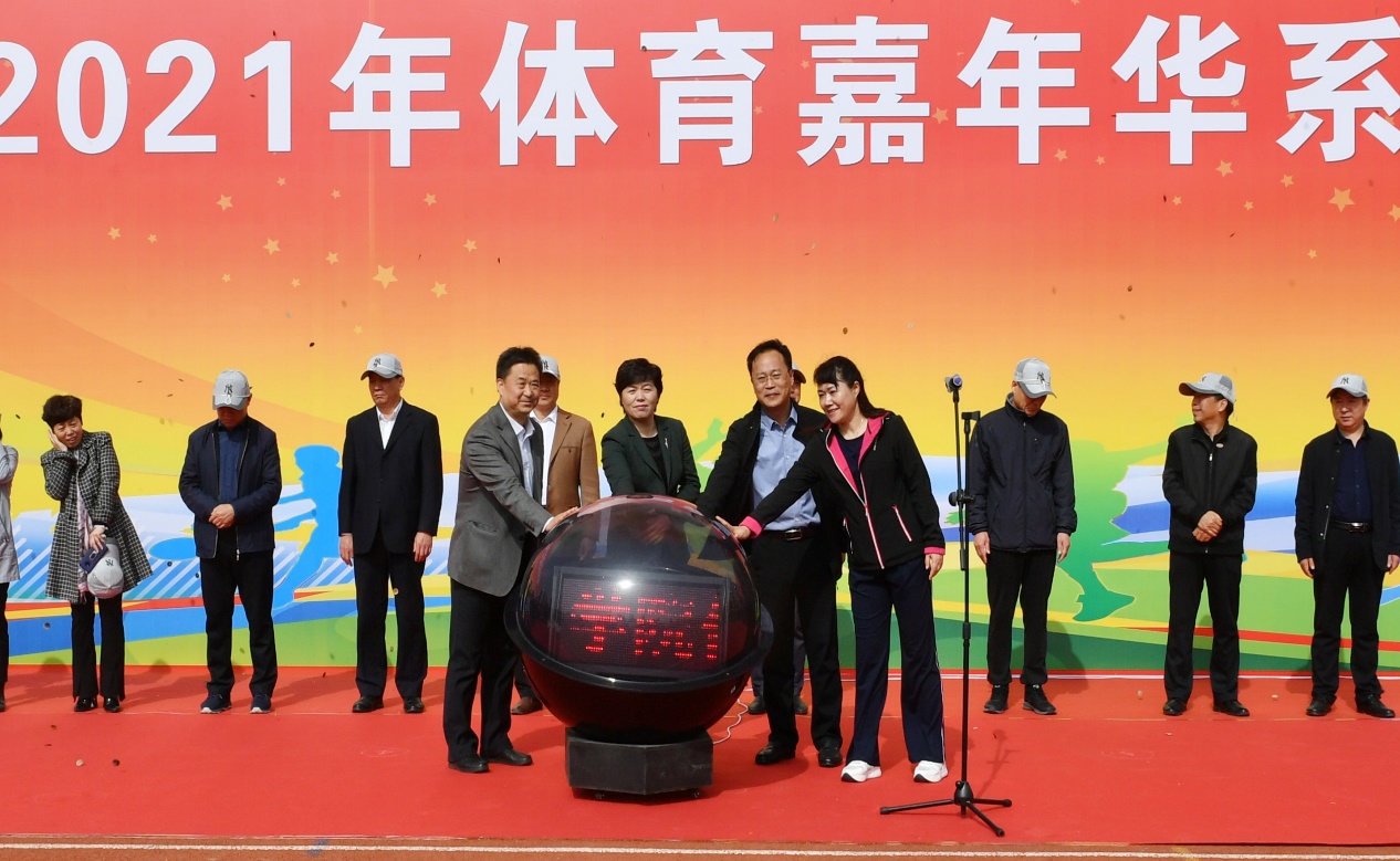 刘春华、郭新伟等共同启动“水晶球”,宣布公司2021年体育嘉年华系列赛事活动暨建党100周年“红色之旅”趣味运动会开幕。