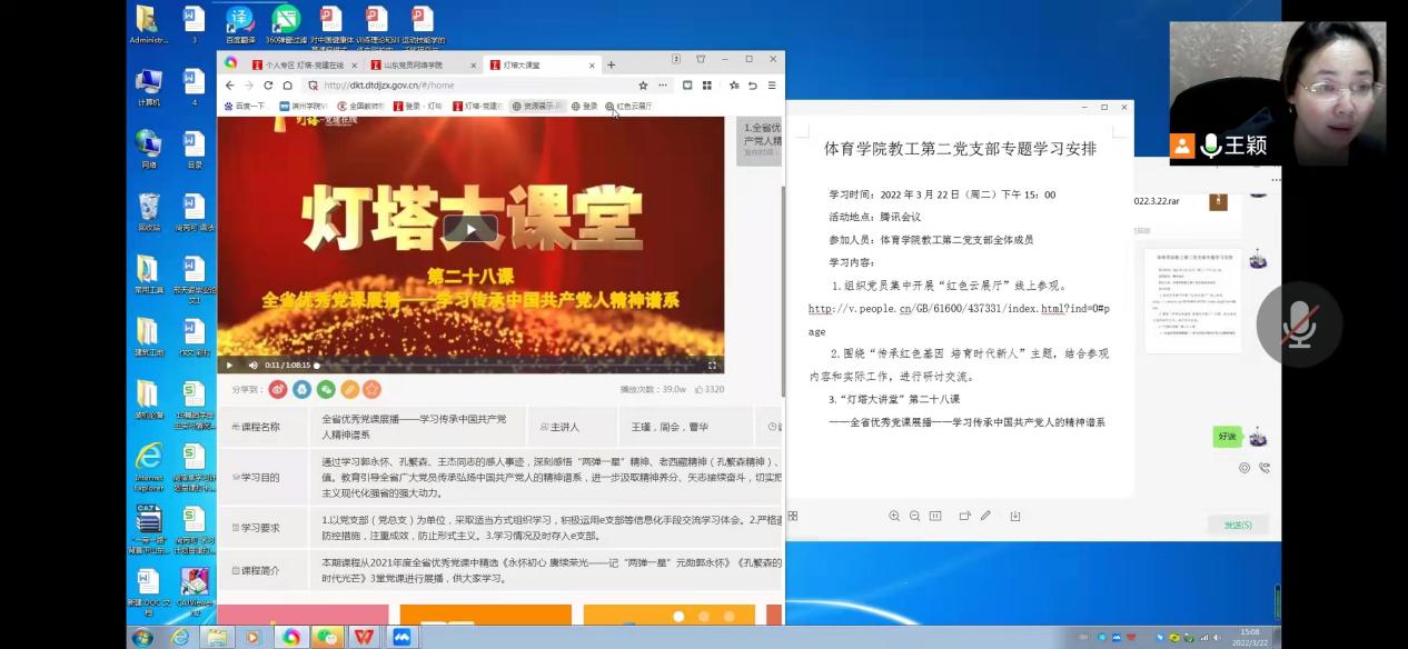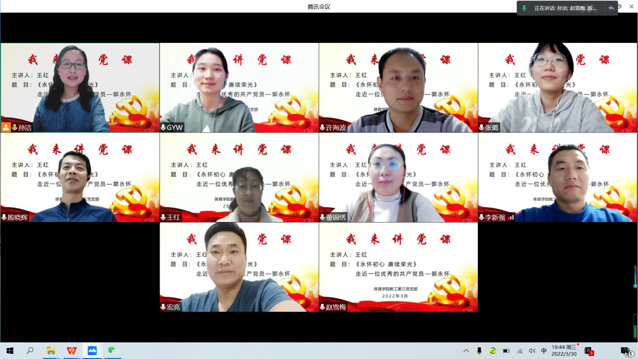 专题党课凝聚人心。封校管理期间,公司党总支书记马新民为员工党员上了一堂题为《传承红色基因,让党旗在抗疫一线高高飘扬》的微党课,和同学们一起分享了公司青年师生、员工踊跃投身疫情防控斗争的感人故事,激励青年党员传承红色基因,充分发挥党员的模范带头作用,让党旗飘扬在抗疫一线、让党徽闪耀在滨院校园。员工党员们深受激励和鼓舞,表示要紧跟党的步伐,履行党员义务,主动担当作为,争当疫情防控排头兵。330日晚上,教工第三党支部的教师党员王红为党支部的党员们上了线上党课《永怀初心 赓续荣光》,她从郭永怀的先进事迹讲起,从爱国、担当、奉献等方面讲述了郭永怀精神和共产党人的初心和使命,并结合当前的抗疫形势激励党员们坚守初心使命,弘扬伟大抗疫精神,她在党课中说道:“在抗疫防控阻击战中,谁都不可能置之度外,作为共产党员,我们应该不忘艰难、冲在前面;作为人民教师,我们应该坚守岗位、主动作为,用自己的实际行动坚守印证初心使命。”