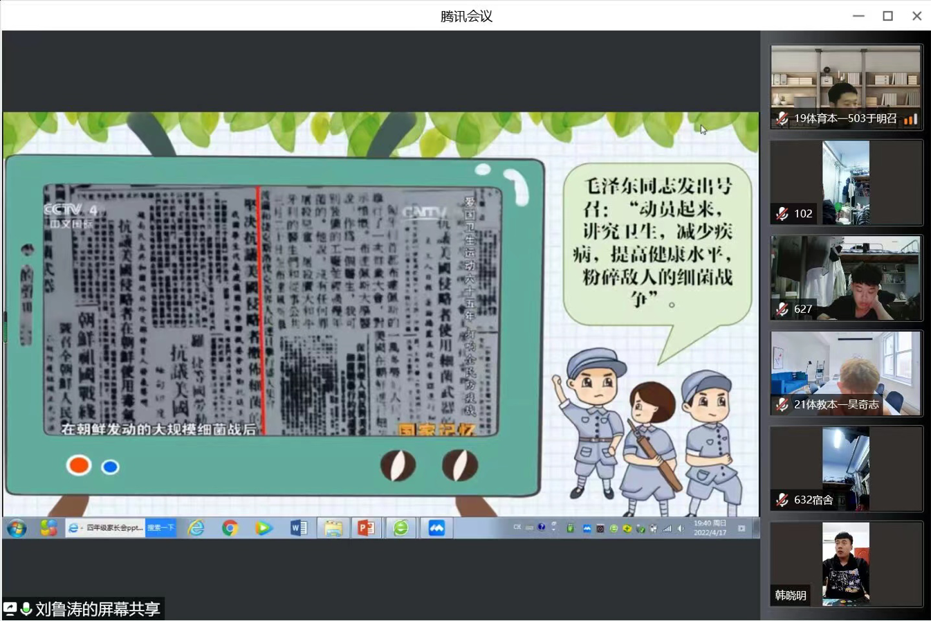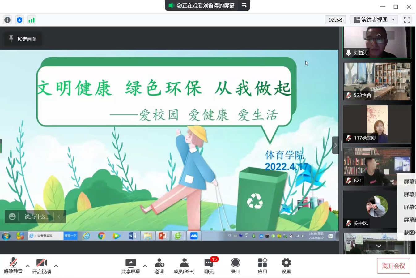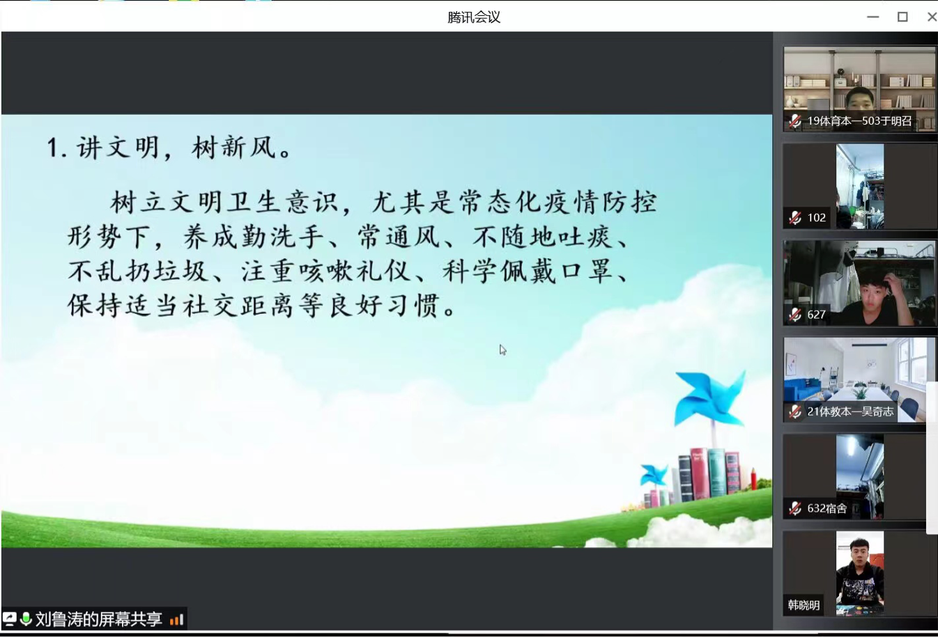 按照疫情防控要求,会议采取线上形式,此次班会由刘鲁涛老师主持,公司全体辅导员、班主任和员工共同参与此次会议。班会主要从爱国卫生月的由来;讲文明,树新风;铸健康,多运动;守绿色,重环保等方面,带领员工一起学习。让员工了解到了爱国卫生月产生的原因和历史背景,引导员工提高环保意识,改变不良的生活方式,养成健康卫生的生活习惯。