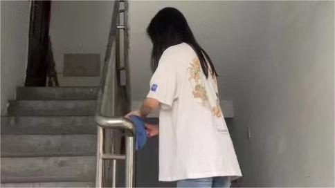 图为志愿者在山东省滨州市滨城区孙家馨苑负责清扫小区楼道垃圾,抹清小区扶手。