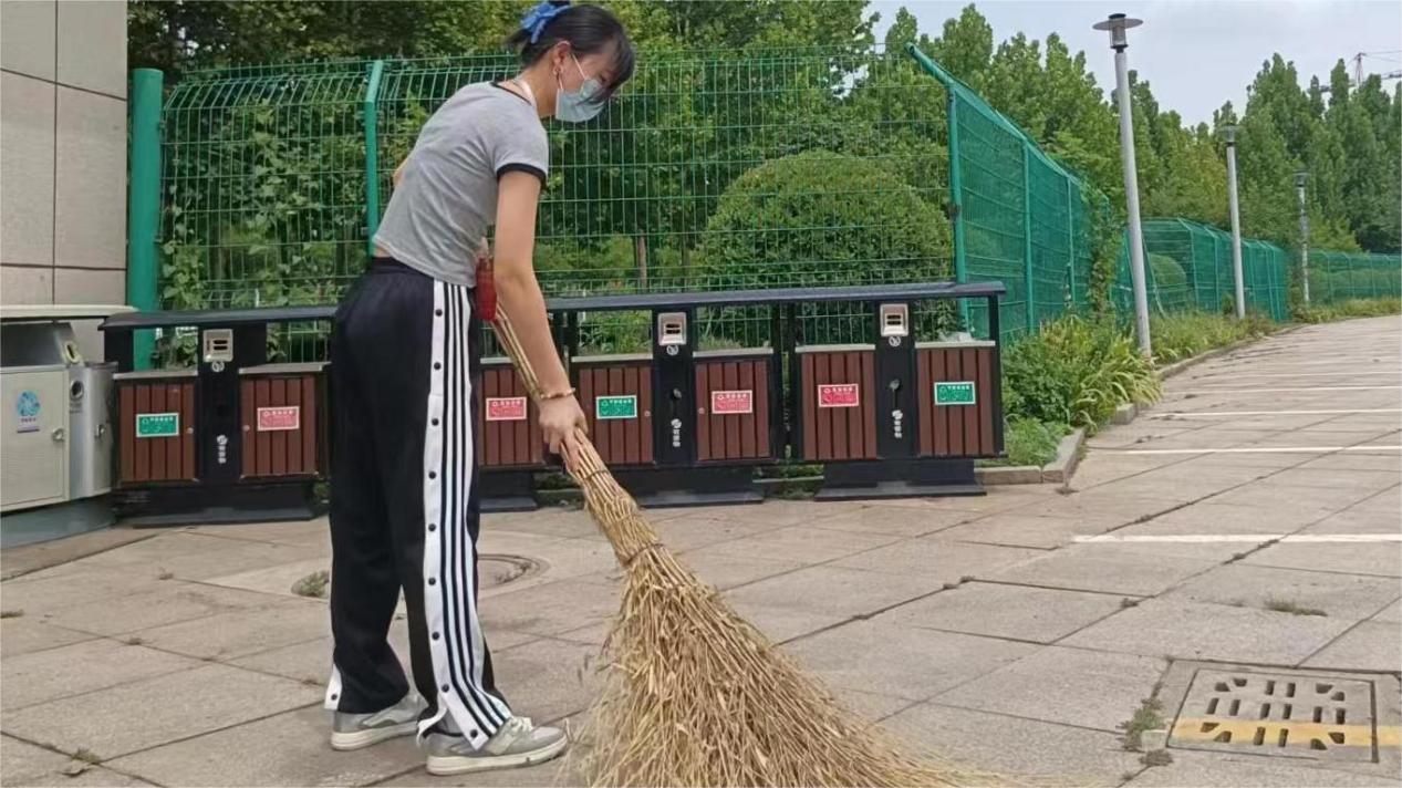 图为志愿者在山东省淄博市高新区某社区负责清扫社区卫生。