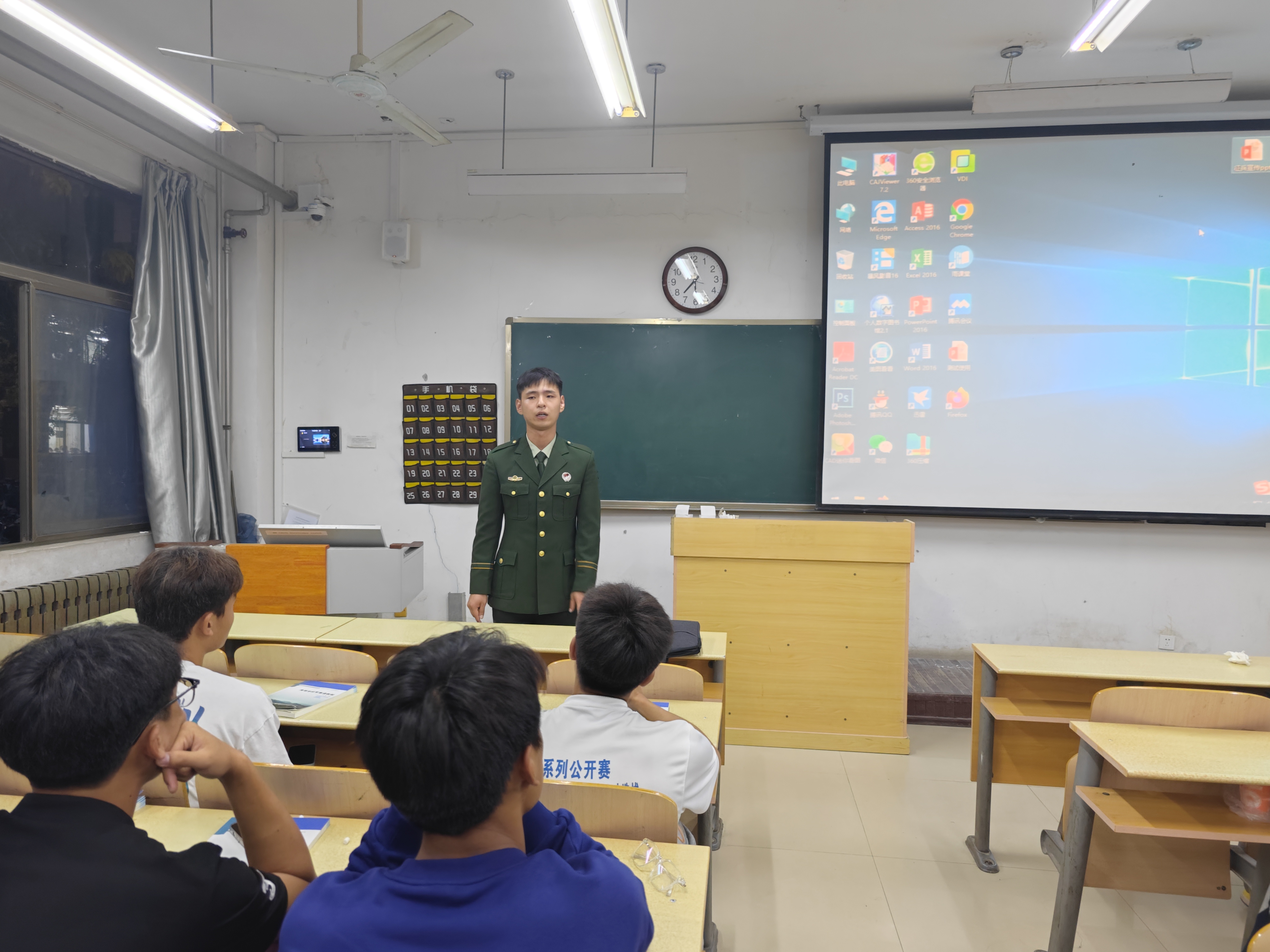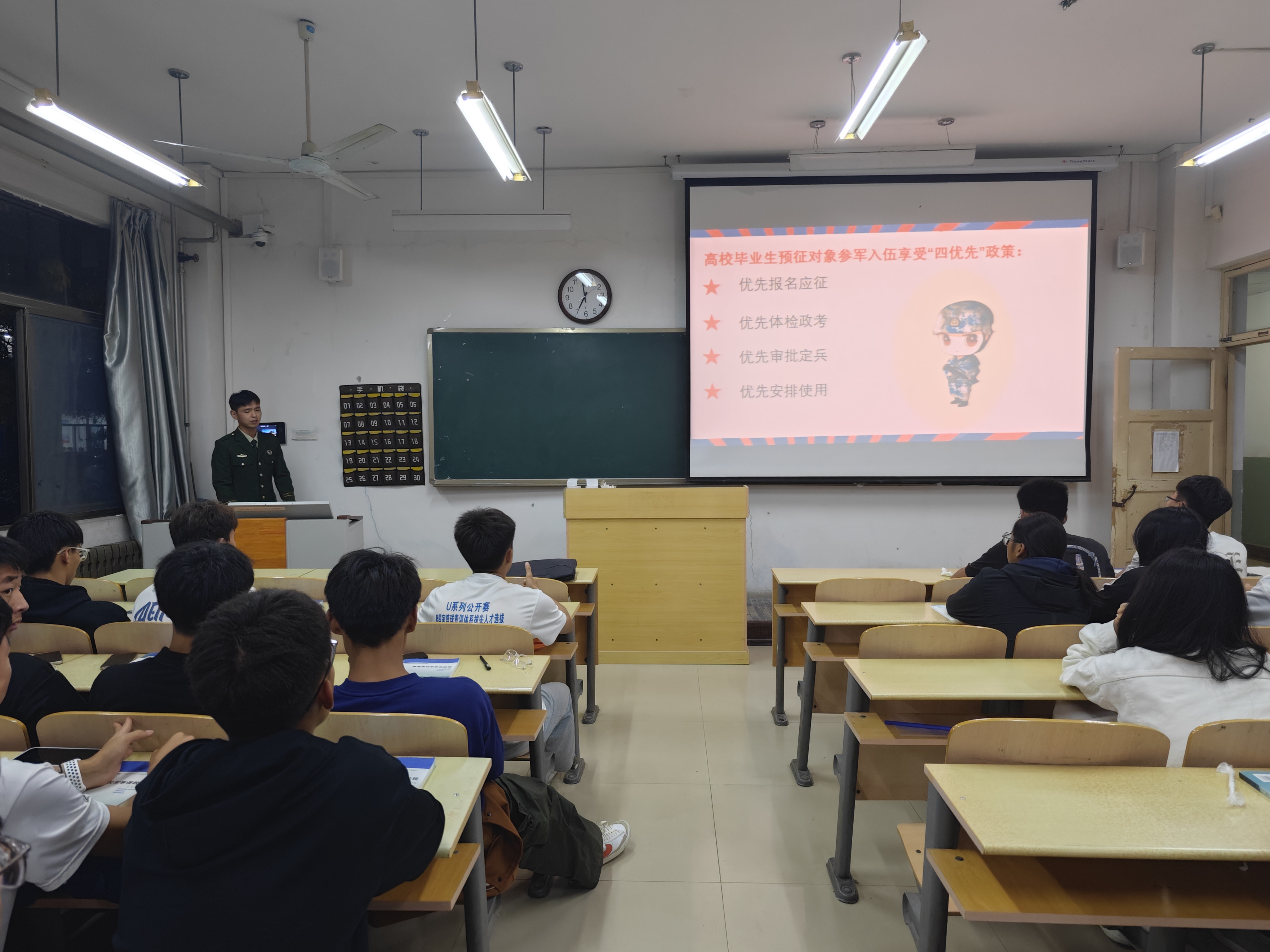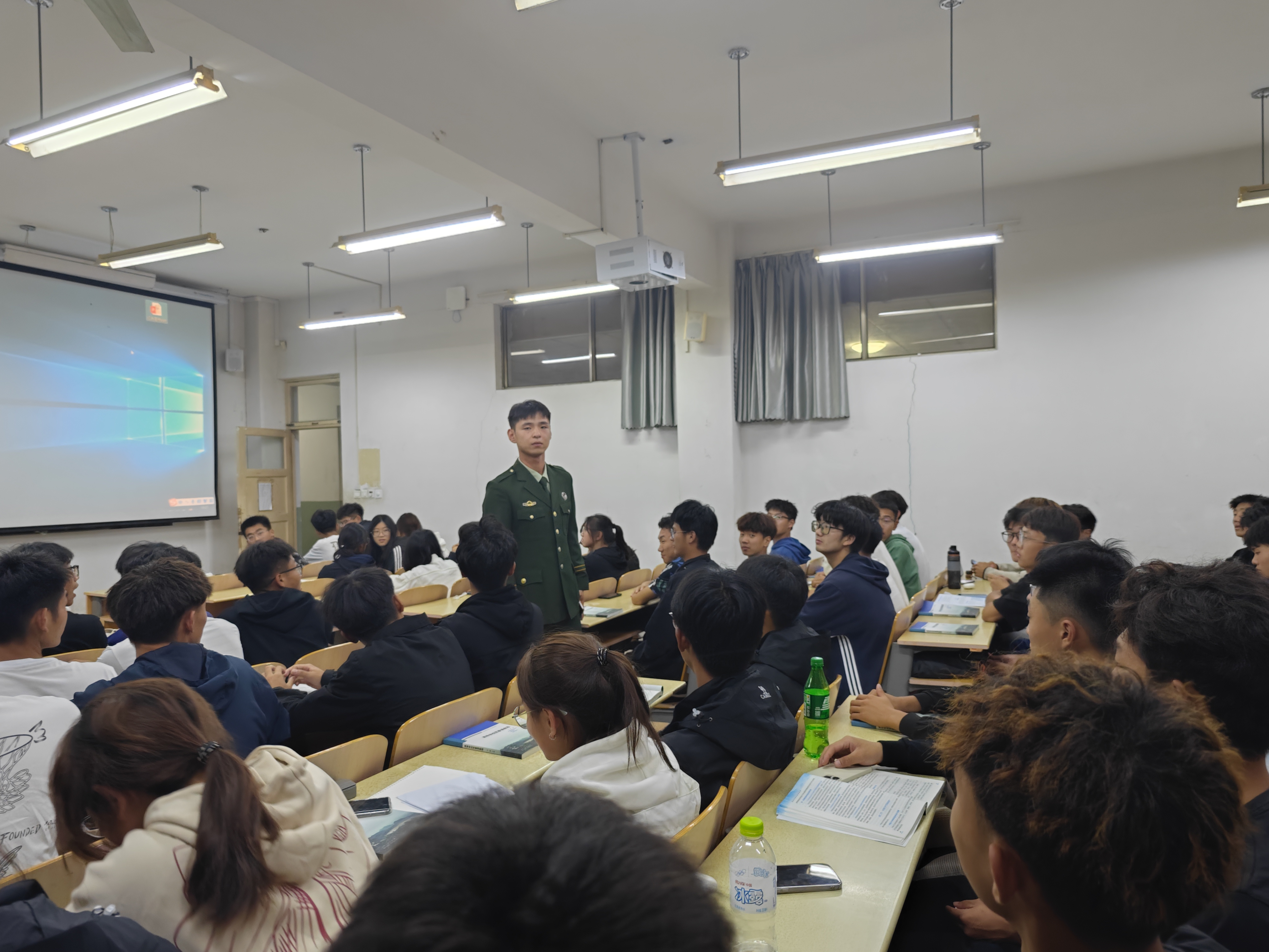周月同学讲述了自己在部队的切身经历与真实感受,他用生动的故事、视频、照片等多种方式向大家分享了自己的军旅生活及参军期间的个人收获,让同学们更深入地了解到军人的艰辛和荣耀。接着就征兵相关政策、标准条件、征兵流程等进行了详细的说明,对报名、体检、学费补偿、学籍保留及未来发展等热点问题进行了解答。最后他鼓励大家将征兵入伍作为一个提升自我的桥梁,将个人理想与富国强军相结合,将个人青春风采融入祖国发展,积极响应国家征兵入伍的号召,投身国防建设的伟大事业。