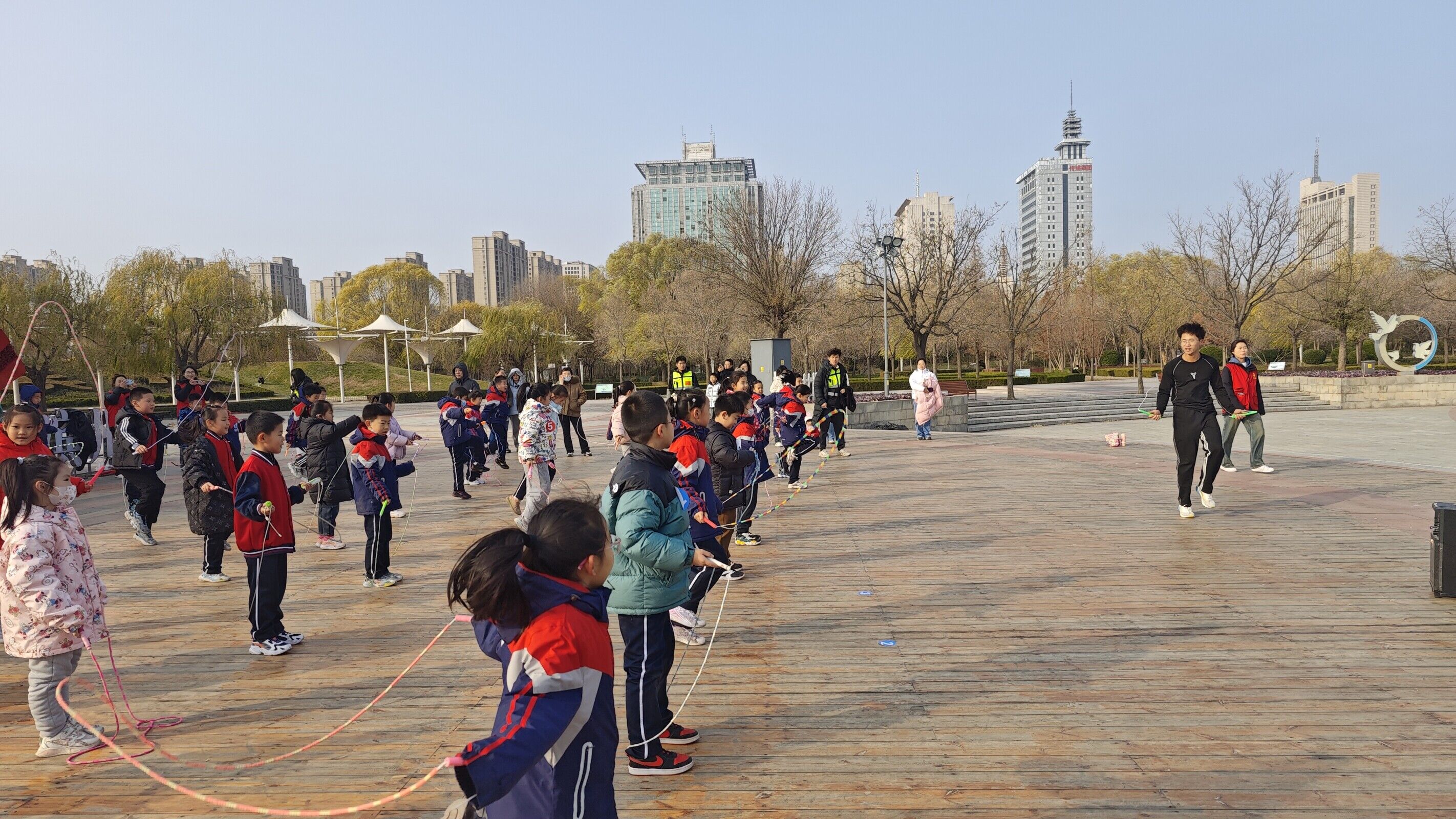 志愿者首先向小员工们介绍了“一·二”九运动的历史背景和意义,接下来奏唱国歌,向革命先烈表达缅怀、敬仰之情,教育引导小员工铭记历史,坚定理想信念,树立远大理想。赛前热身环节,由滨州公司科技体育社团的队员带来了精彩的花样跳绳表演,并教授他们简单的花样跳绳动作。热身结束后,科技体育社团指导老师朱春明带领员工们学习定向运动的识图、用图知识以及比赛规则。