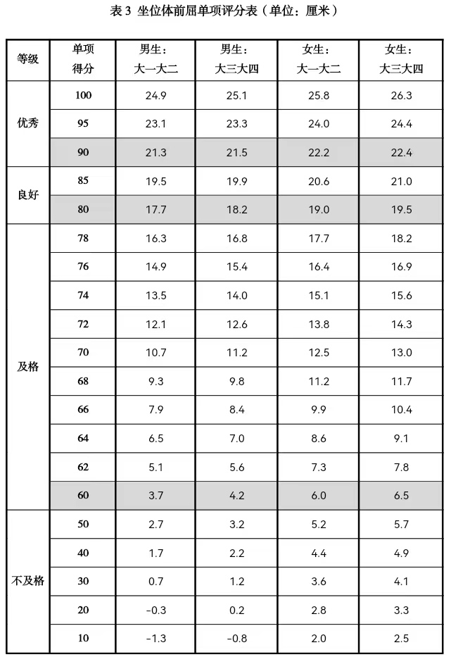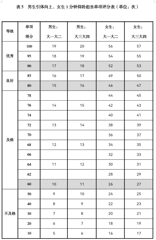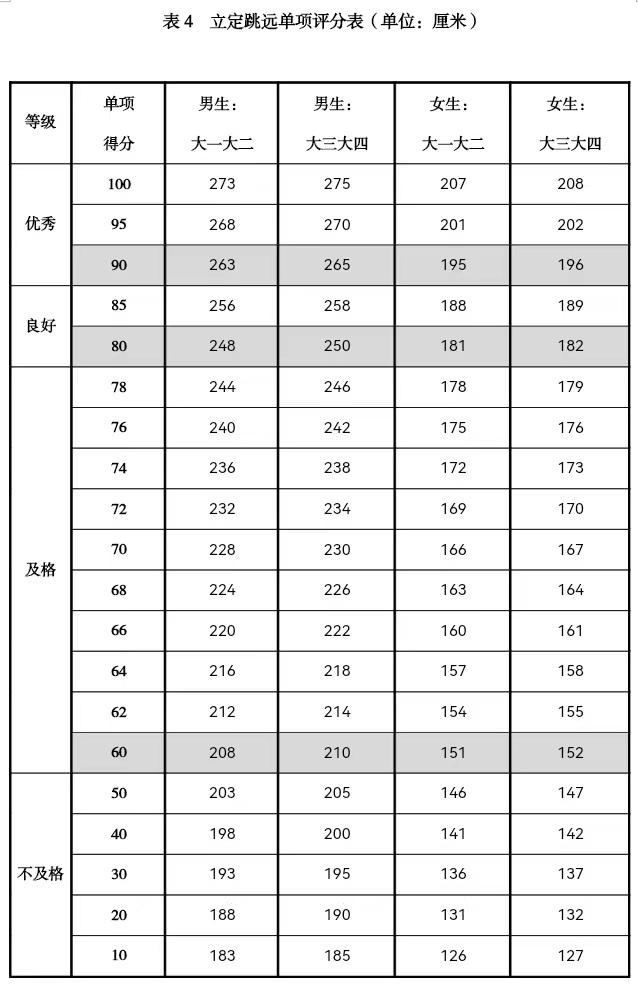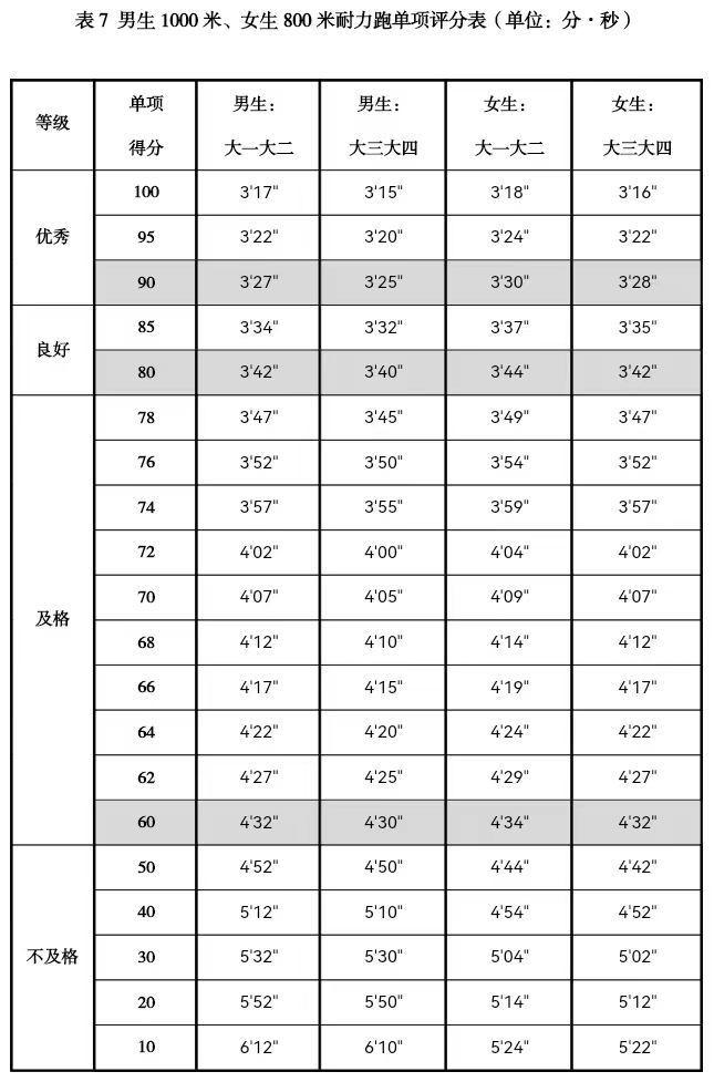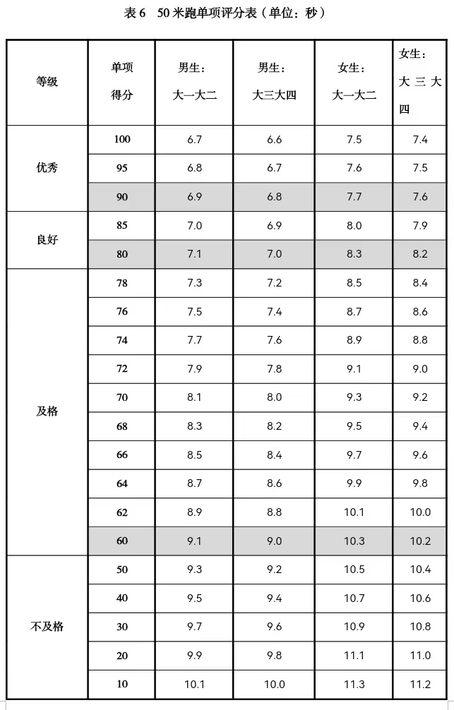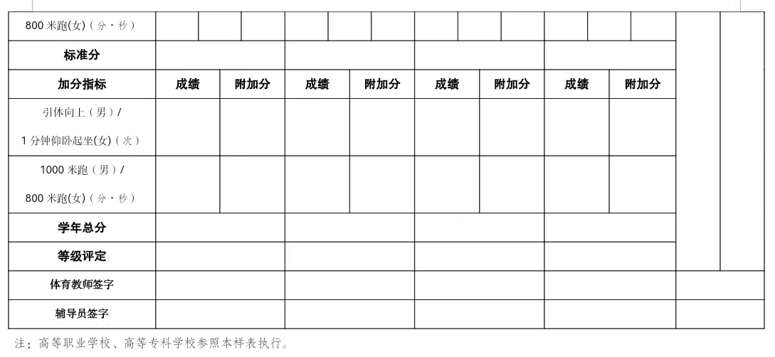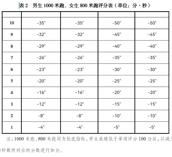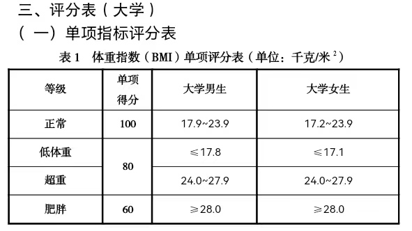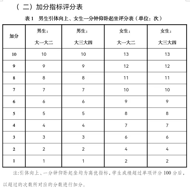 6.本标准的学年总分由标准分与附加分之和构成,满分为120分。标准分由各单项指标得分与权重乘积之和组成,满分为100分。附加分根据实测成绩确定,即对成绩超过100分的加分指标进行加分,满分为20分;小学的加分指标为1分钟跳绳,加分幅度为20分;初中、高中和大学的加分指标为男生引体向上和1000米跑,女生1分钟仰卧起坐和800米跑,各指标加分幅度均为10分。
