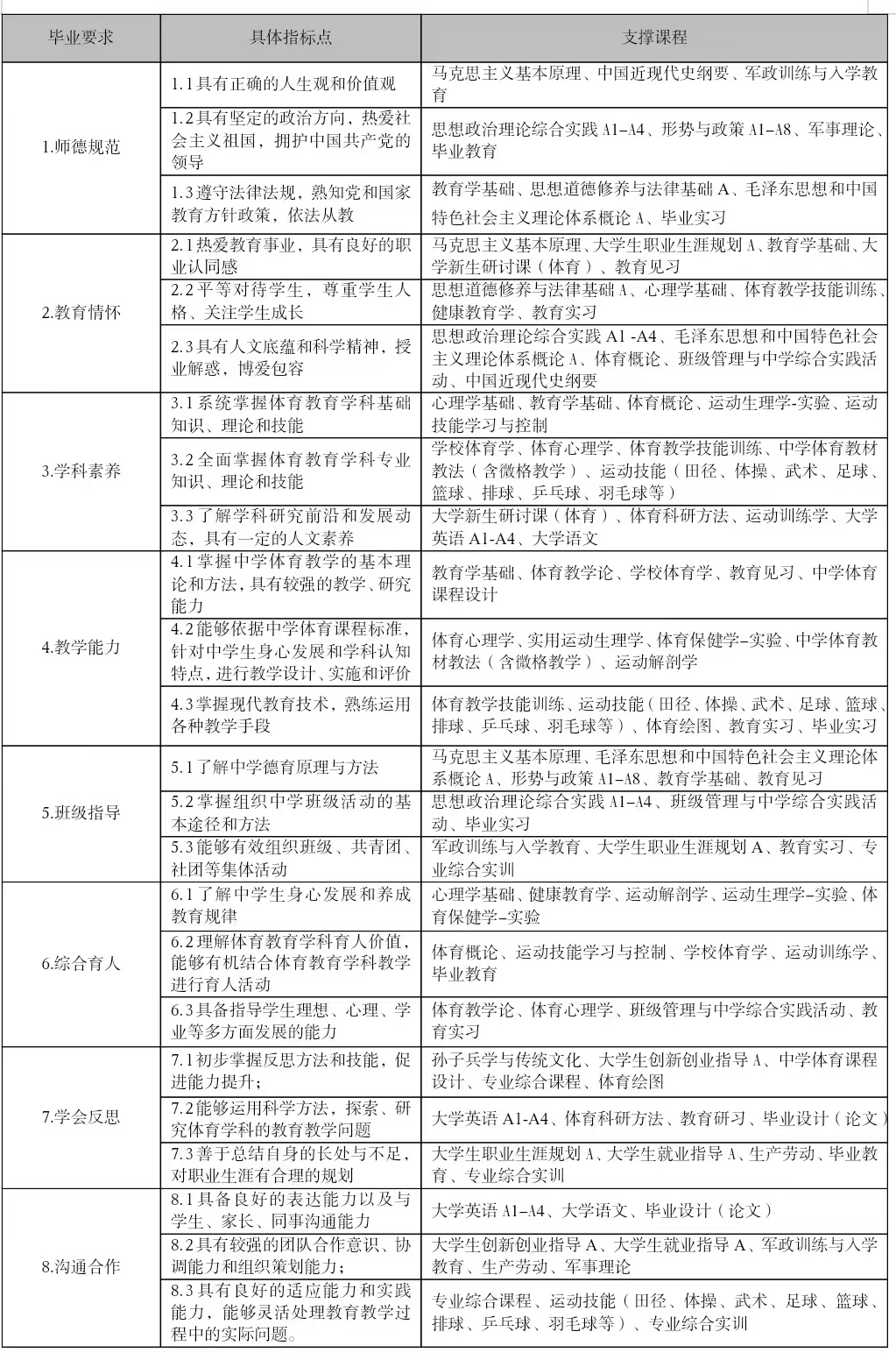 3. 学科素养:掌握完整的体育教育学科理论知识和技能,了解相关学科知识。
