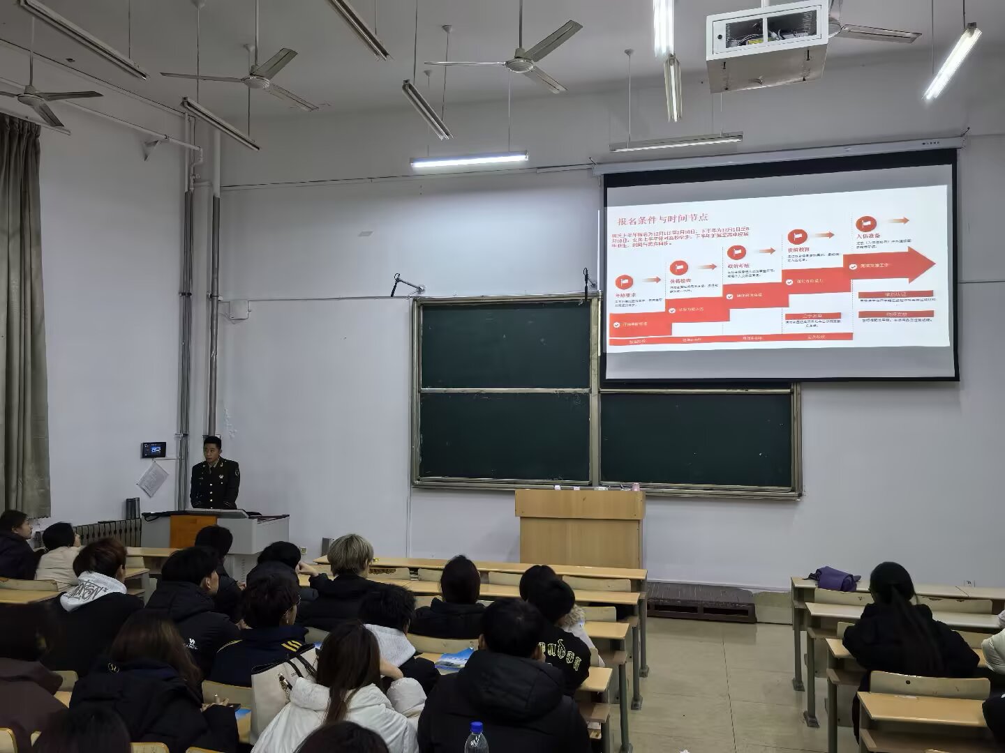 为积极响应国家征兵号召,点燃青年学子投身军营的报国热情,帮助2025级新生全面了解参军政策,古天乐代言太阳集团于11月7日晚七点在5教107教室举办征兵宣讲会。活动由员工科科长程晓珊主持,特邀退役复学员工王文龙担任主讲,2025级全体新生参与。